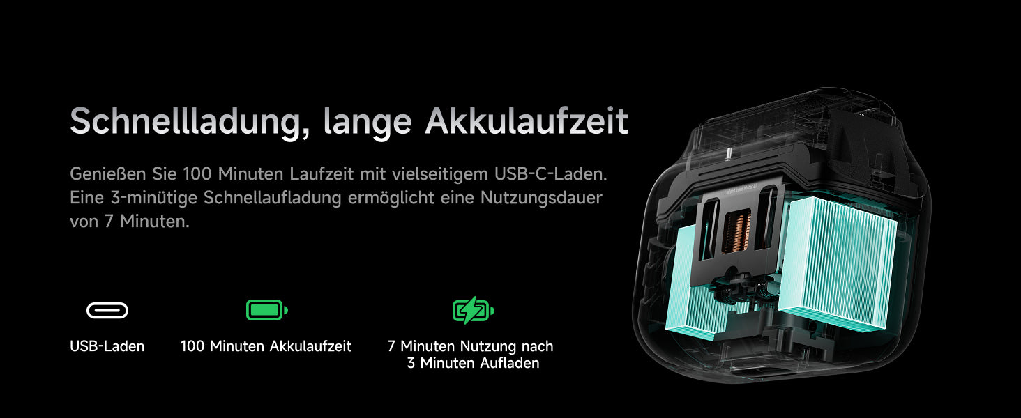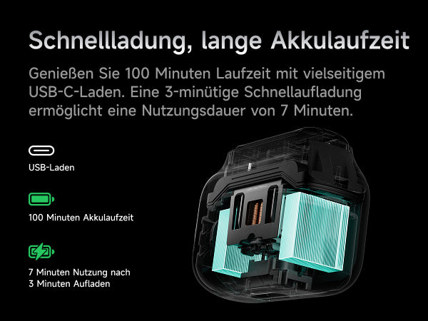 Genießen Sie bis zu 100 Minuten Akkulaufzeit mit USB-C-Schnellladung. Eine 3-minütige Schnellladung ermöglicht eine Nutzungsdauer von bis zu 2 Monaten. Das kompakte Design im Taschenformat mit Reisemodus verhindert versehentliche Aktivierungen und ist somit ideal für unterwegs.