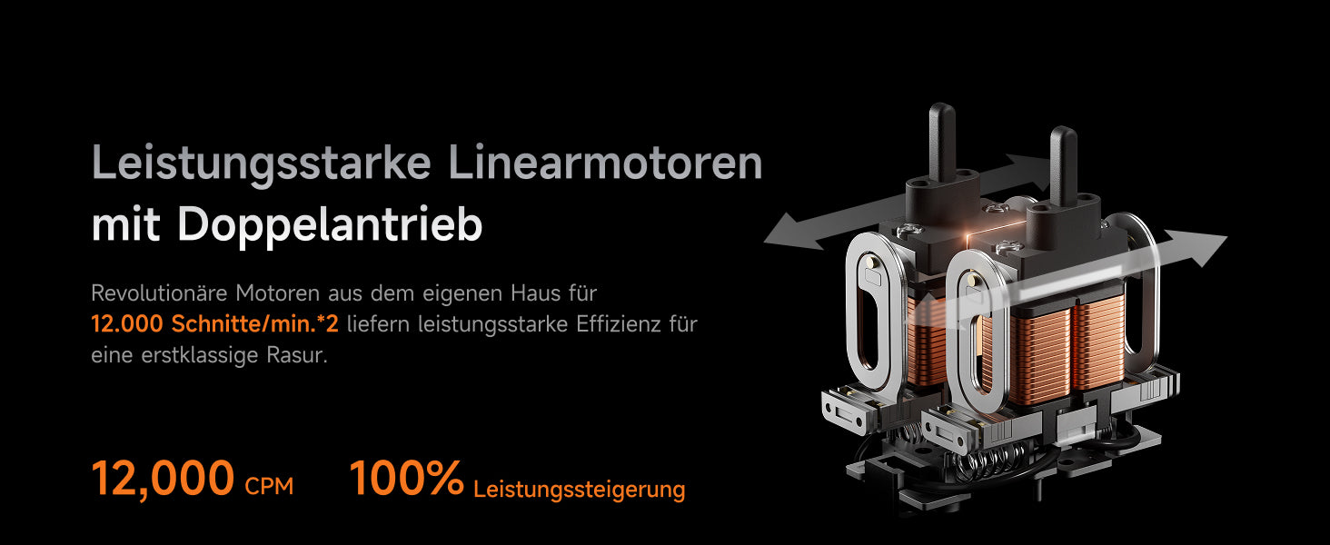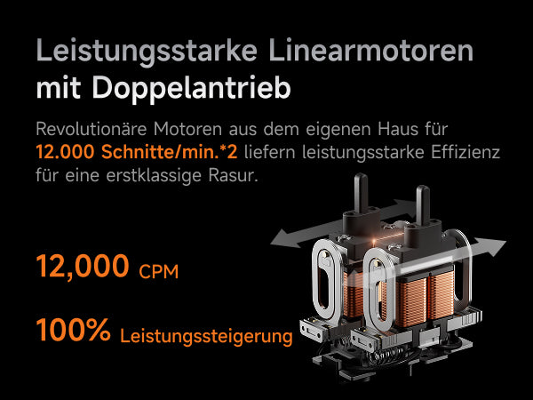mit Doppelantrieb schafft 12.000 Schnitte pro Minute und bewältigt mühelos auch dicke und widerspenstige Bärte. Die Leistungsanpassung in Echtzeit sorgt für eine sanfte, ziehfreie Rasur. Die 0,055 mm* ultradünne Scherfolie und die Präzisionsklingen aus Edelstahl steigern die Effizienz, während die doppelte Stoßdämpfung für einen stabilen, bequemen Griff sorgt.