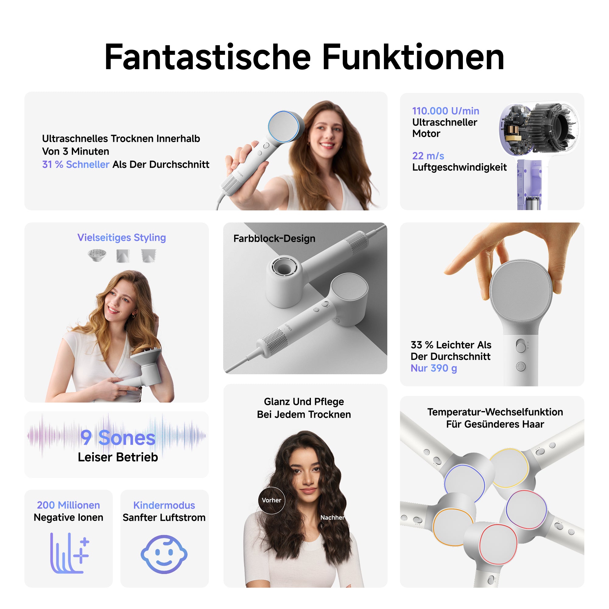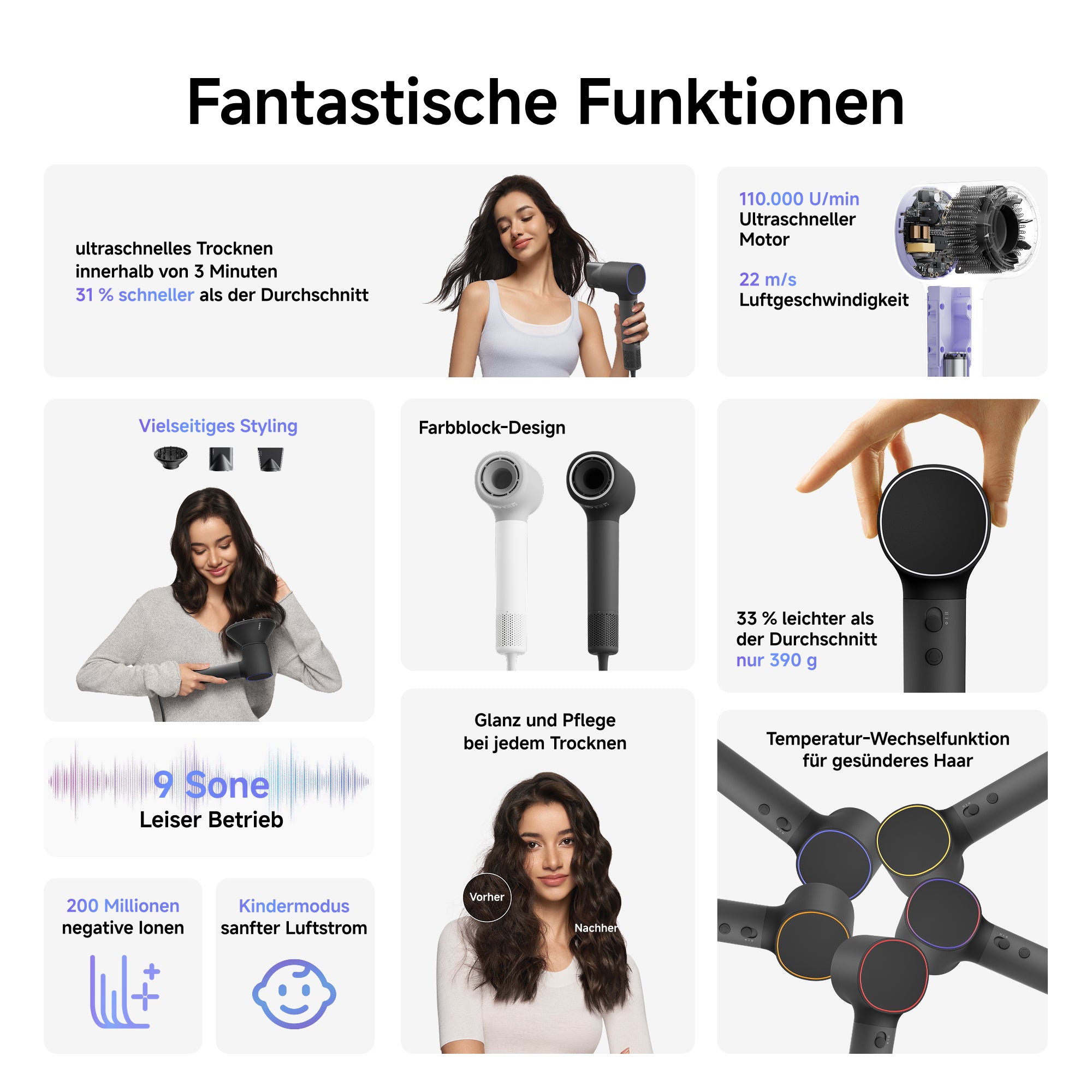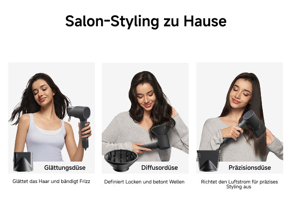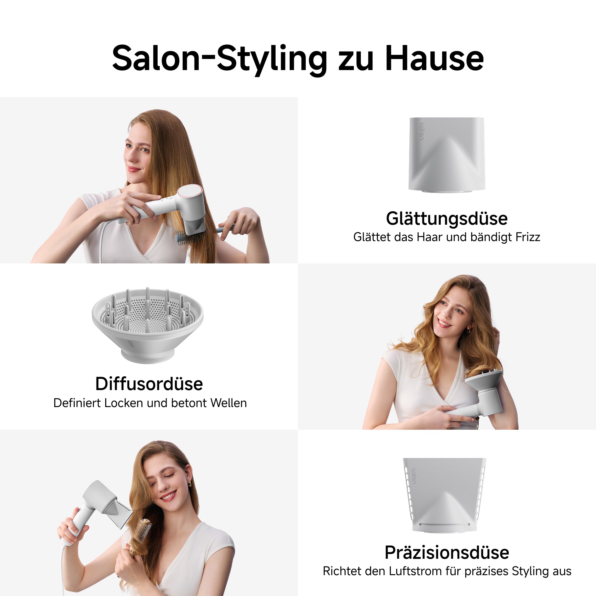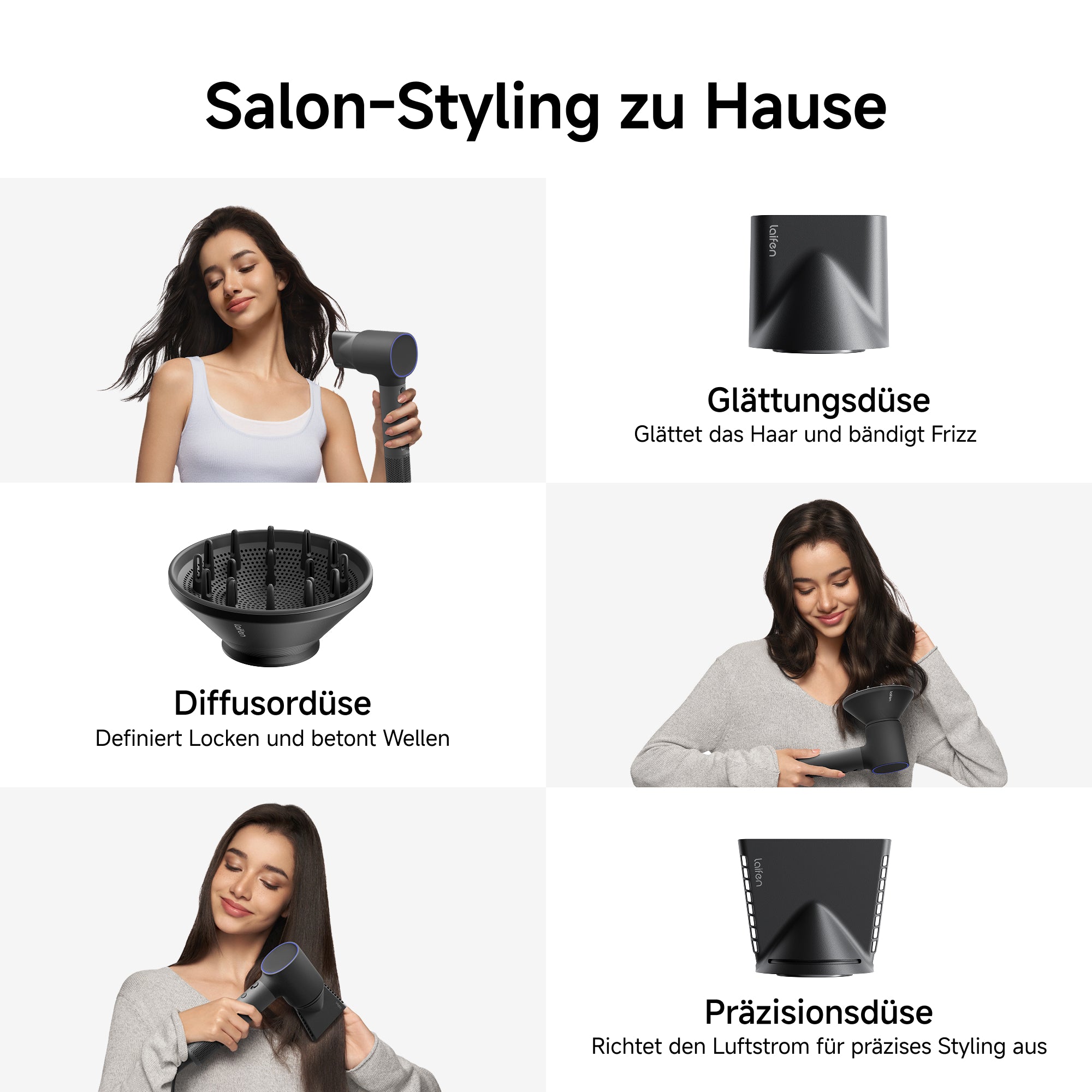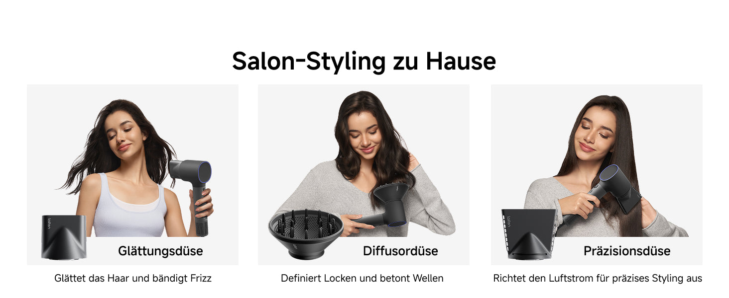 Der Laifen Neo wird mit Laifen-Düsen geliefert (Glättung, Diffusor,Präzisionsdüse), damit du alle deine Haarstyling-Träume verwirklichen kannst – von glatten Looks bis zu definierten Locken.