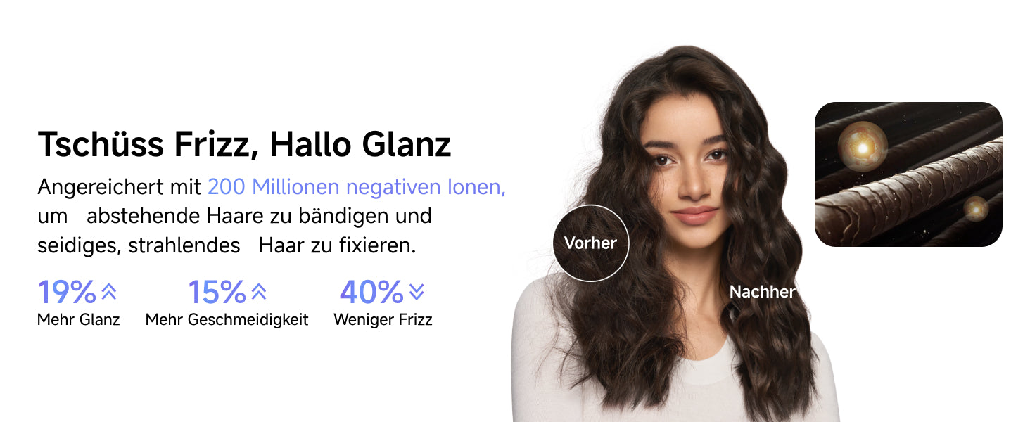 200 Mio. negative Ionen – weniger Frizz, mehr Glanz & Feuchtigkeit